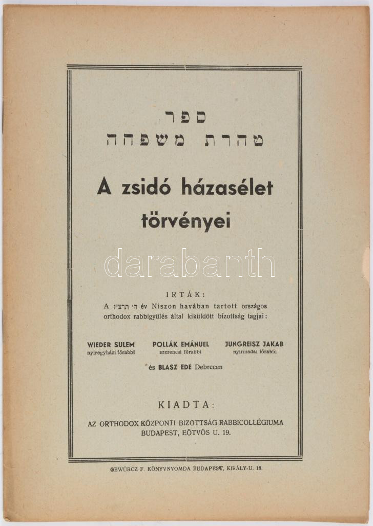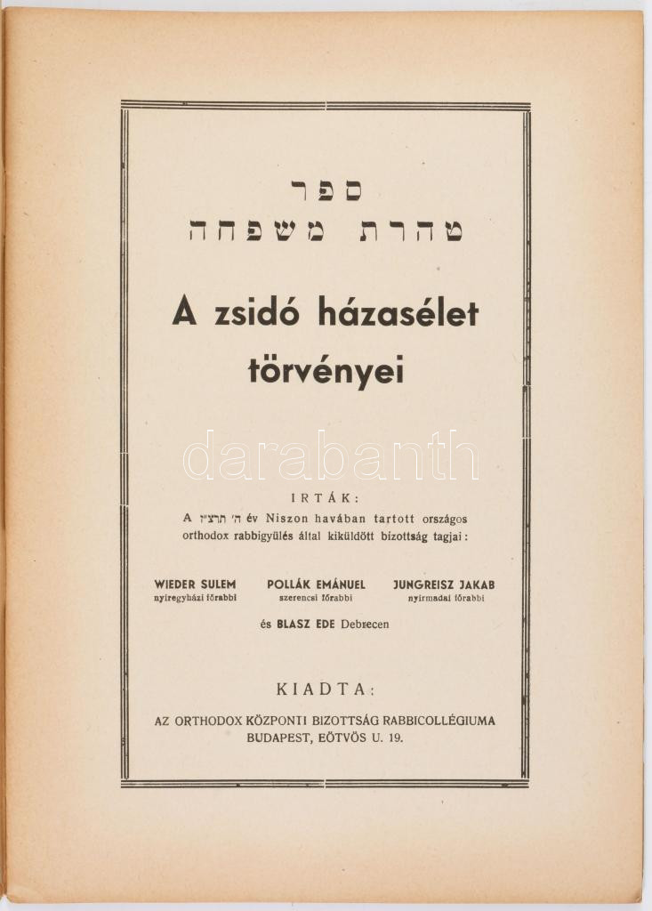 Wieder Sulem - Pollák Emánuel - Jungreisz Jakab - Blasz Ede: A zsidó házasélet törvényei. Bp., Orthodox Központi Bizottság Rabbicollégiuma, 30p Kiadói papírborítóval