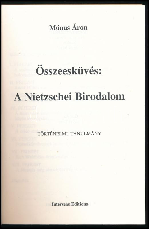 Mónus Áron: Összeesküvés: A Nietzschei Birodalom. Történelmi tanulmány. A szerző, Mónus Áron (1934-) által aláírt példány! Santon (Isle of Man), 1991, Interseas Editions. Kiadói papírkötés.
