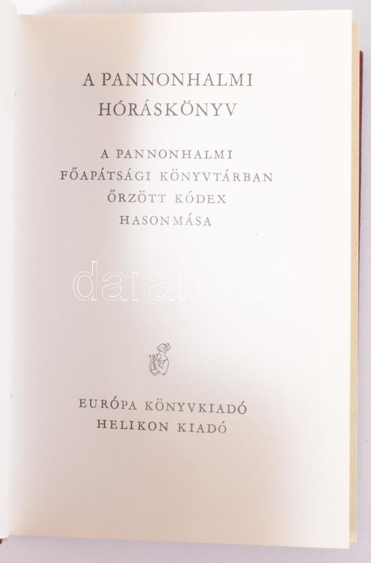 A Pannonhalmi Hóráskönyv. A Pannonhalmi Főapátsági Könyvtárban őrzött kódex hasonmása. Bp., 1982, Európa - Helikon. Kiadói aranyozott bársonykötés, kiadói papírtokban.