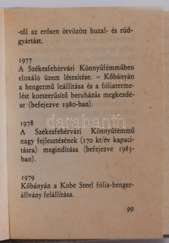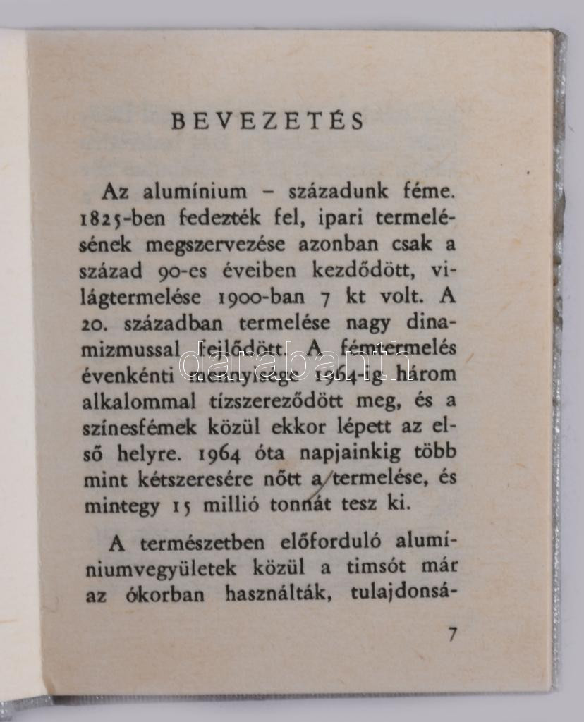 Dr. Várhegyi Győző: A magyar aluminium rövid krónikája. Miskolc, 1984, "Péch Antal" Miniatűrkönyv Gyűjtők Klubja. Kiadói egészvászon kötés. Számozott (294./2100) példány, fekete számozással. Kereskedelmi forgalomba nem került.