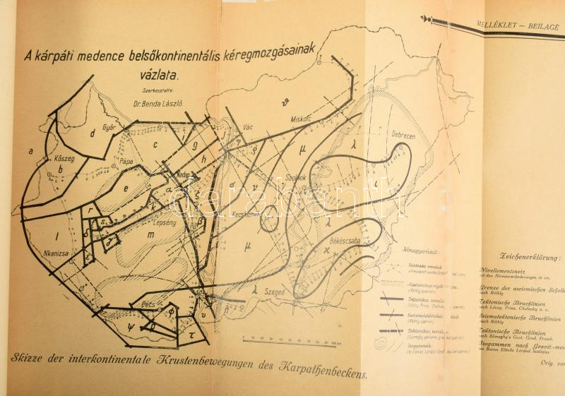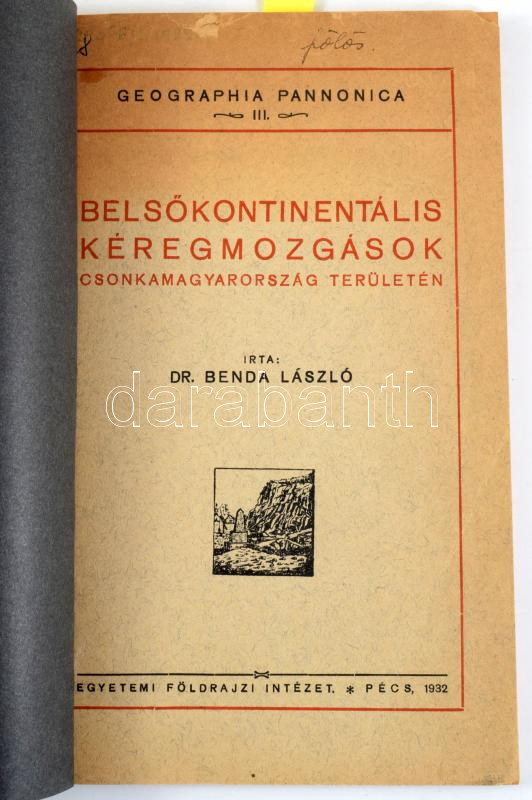 Dr. Benda László: Belsőkontinentális kéregmozgások Csonkamagyarország területén. Pécs, 1932. Egyetemi Földrajzi Intézet. .114p. + 1 kih t. Kiadói papírkötésben, papír védőborítóval, térkép ragasztott.
