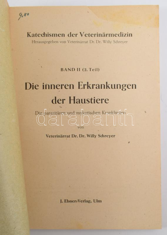 Willy Schreyer: Der inneren Erkrankungen der Haustiere. Ulm,1948,J. Ebner-Verlag. Német nyelven. Kiadói papírkötés, a címlapon hiánnyal.