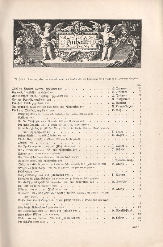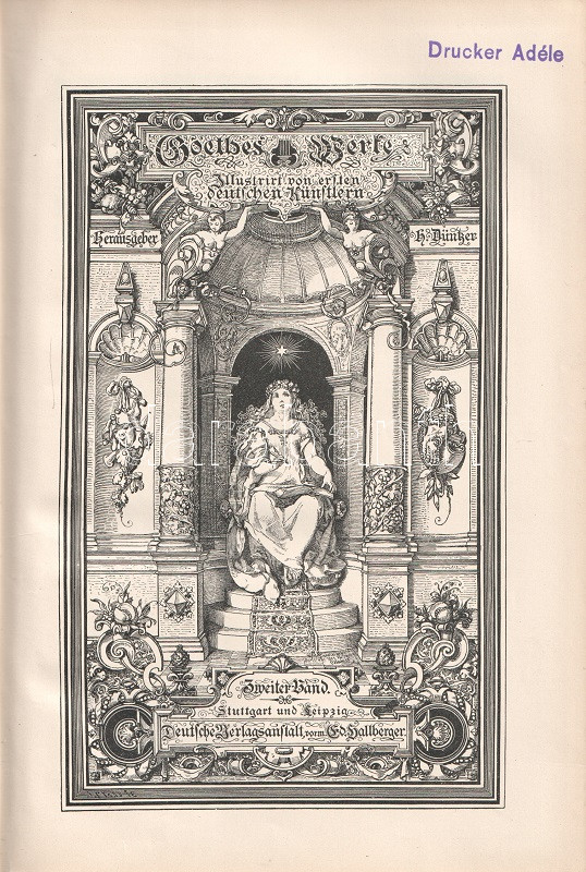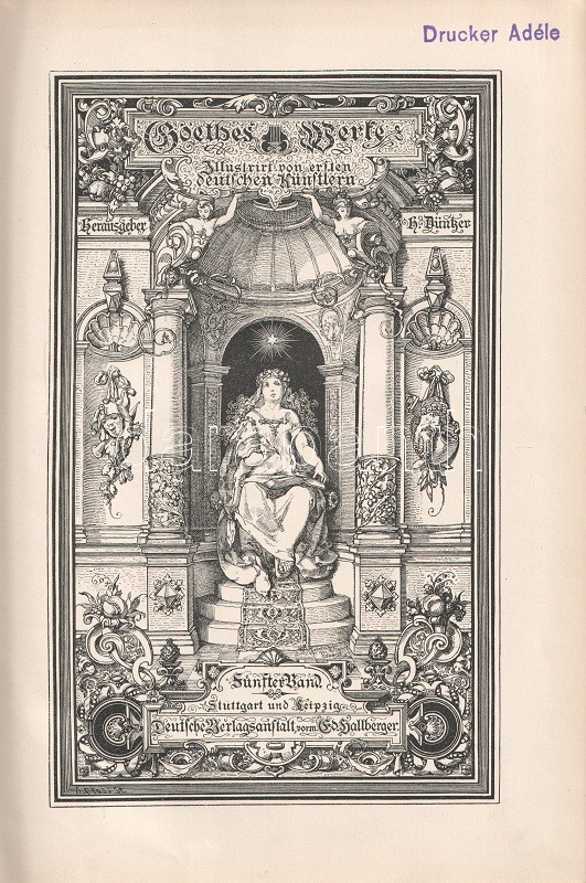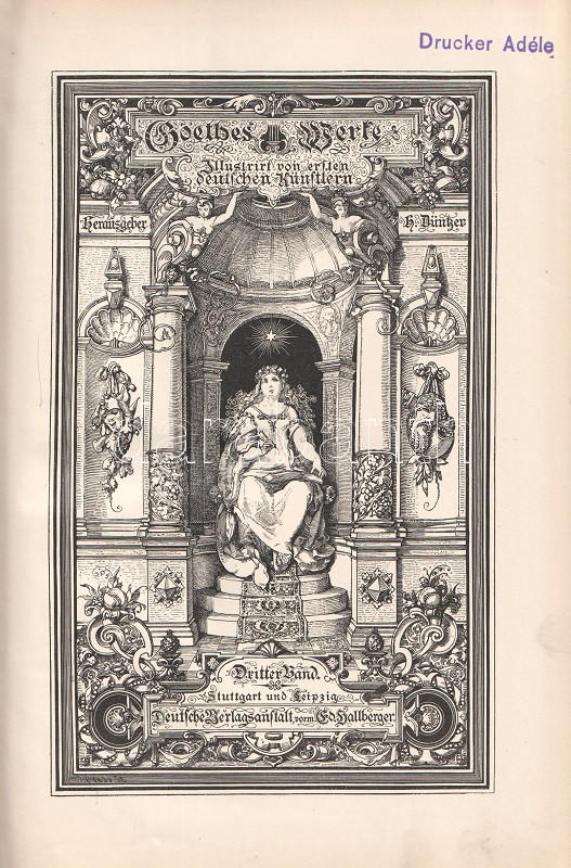 A Heinrich Düntzer (1813-1901) irodalomtörténész, Goethe-kutató által szerkesztett, gazdagon illusztrált Goethe-kiadás a német polihisztor irodalmi életművét adja közre öt kötetben. Az első kötetben Goethe lírai, a második és harmadik kötetben drámaírói életműve, a negyedik és ötödik kötetben szépprózája és önéletrajzi írása. Gazdagon illusztrált köteteink rajzanyaga a cselekmény illusztrálásán kívül érzékletes képet adnak Goethe korának társaséletéről, öltözködési és modorkonvencióiról, kiemelten a forradalom előtti korszaktól a századfordulós évekig (1770-1810), Goethe legtöbb szövege ugyanis erre az időszakra vonatkozik.