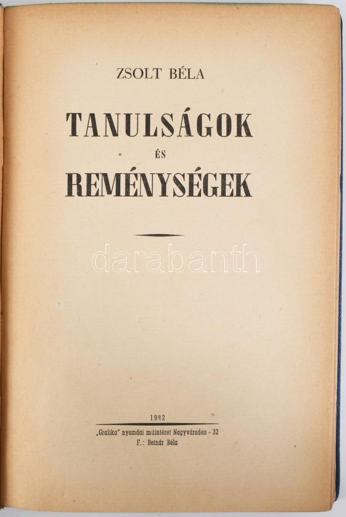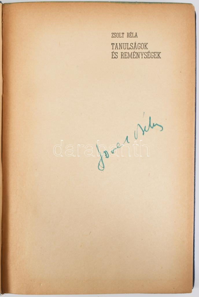Zsolt Béla: Tanulságok és reménységek. A szerző, Zsolt Béla által ALÁÍRT példány. Nagyvárad, 1942, "Grafika", 197+3 p. Kiadói aranyozott egészvászon-kötés, kissé kopott borítóval, a gerincen kis sérüléssel, két kijáró lappal, a gerinc mentén néhány lapon sérülésekkel.