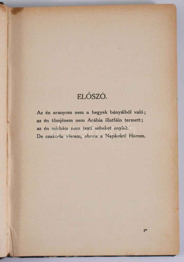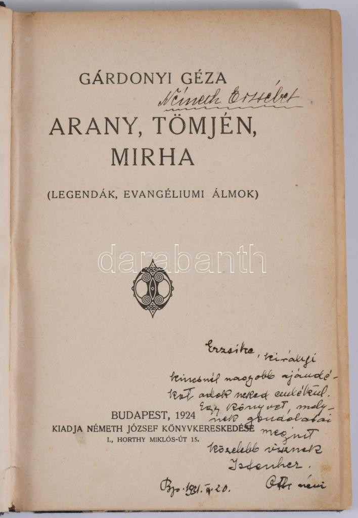 Gárdonyi Géza: Arany, tömjén, mirha. (Legendák, evangéliumi álmok.) Bp., 1924, Németh József, 184 p. Átkötött félvászon-kötés, kissé kopott borítóval, ajándékozási sorokkal.