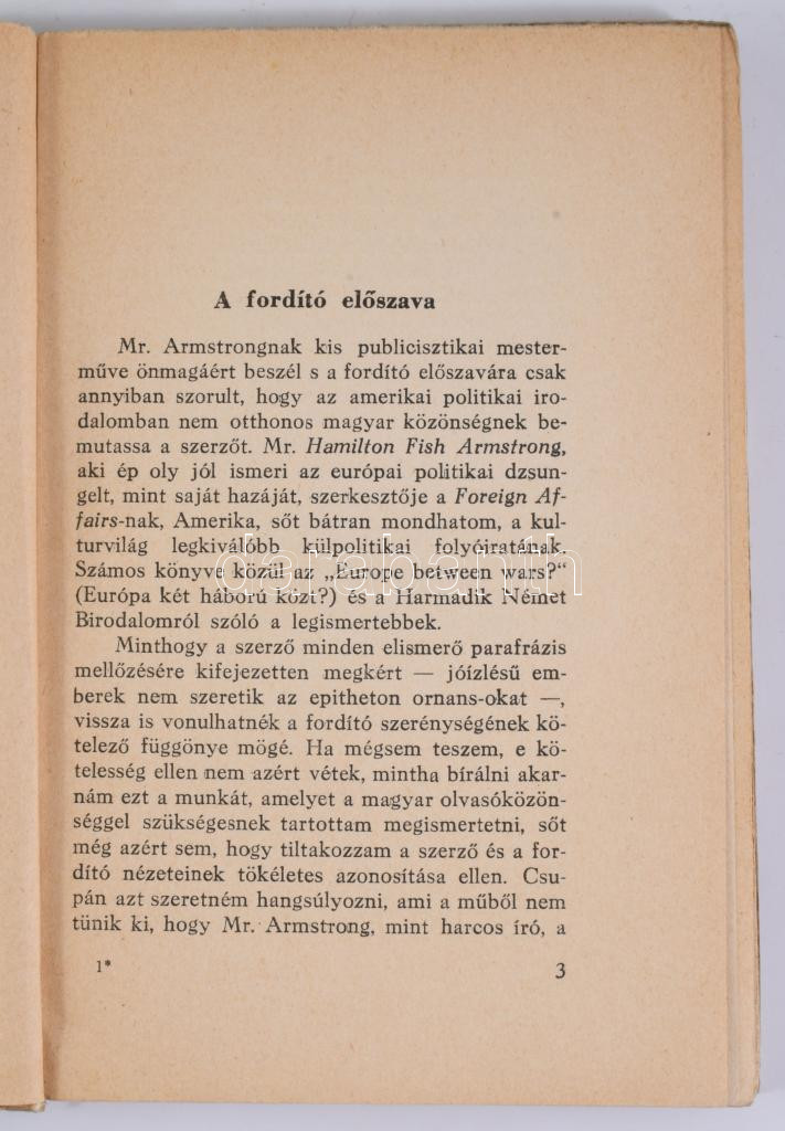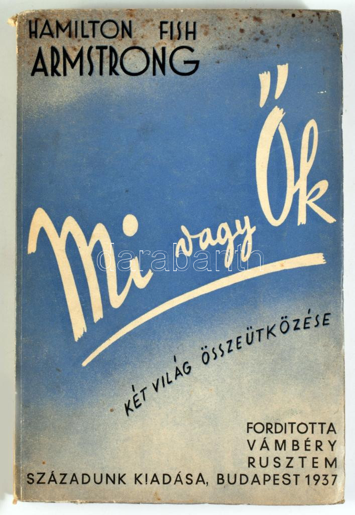 Hamilton Fish Armstrong: MI vagy Ők. Két világ összeütközése. Ford.: Vámbéry Rusztem. Bp.,1937, Századunk, 120+1 p. A borító rajza K. Görög Ata munkája. Kiadói papírkötés, foltos, kopott borítóval, a hátsó borító alsó sarkán gyűrődéssel.