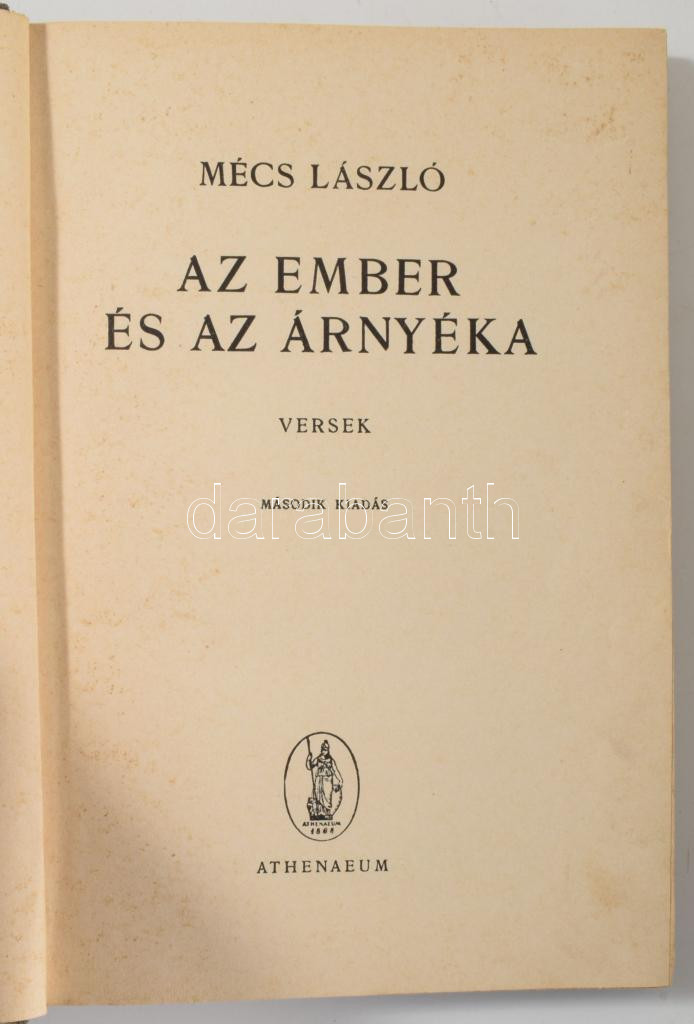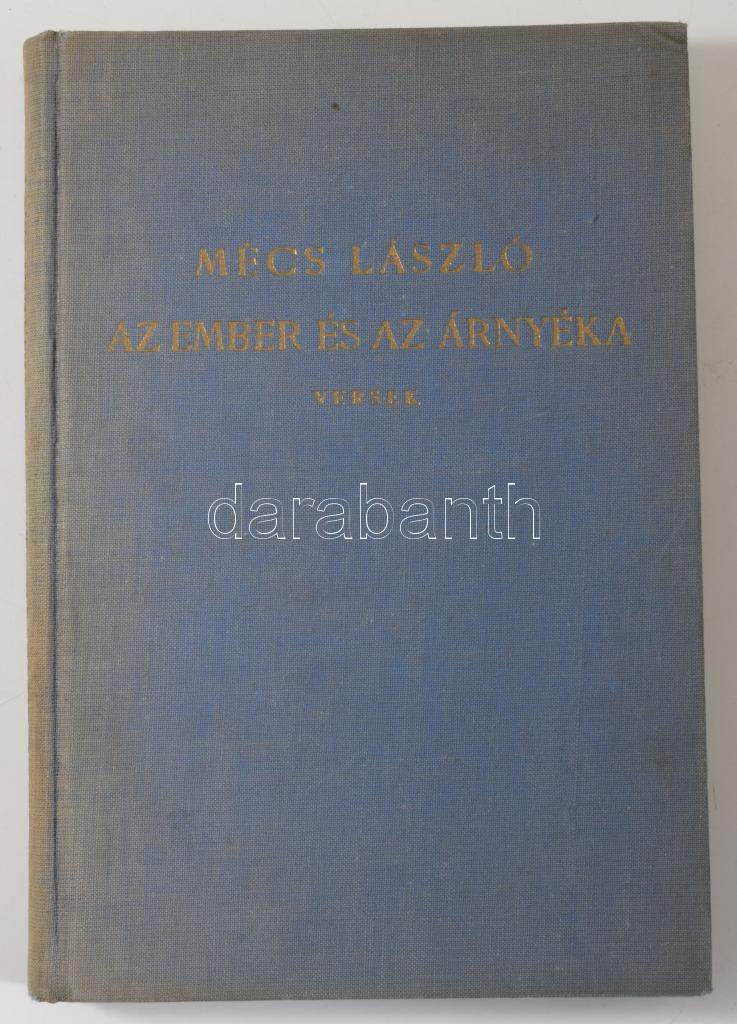 Mécs László: Az ember és az árnyéka. Versek. Bp., [1941], Athenaeum, 149+[3] p. Második kiadás. Kiadói egészvászon-kötés, kissé fakó gerinccel, ajándékozási bejegyzéssel. Számozott, 842. számú példány.