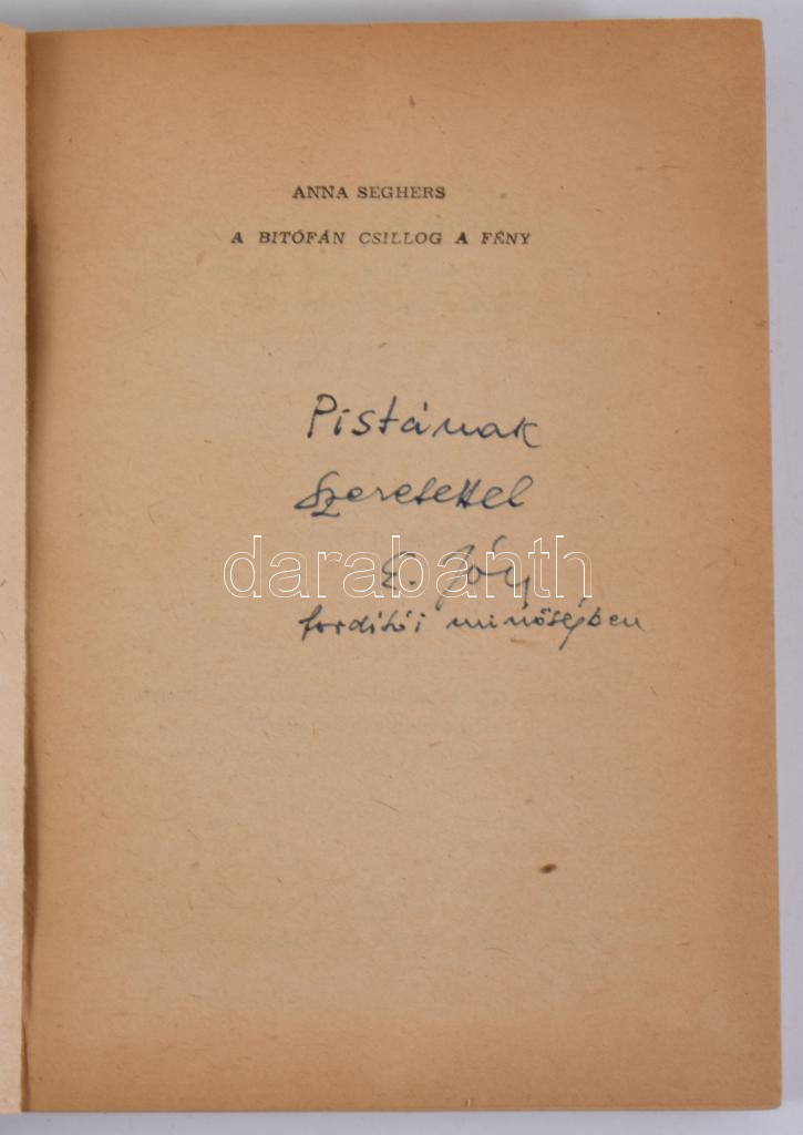 Anna Seghers: A bitófán csillag a fény. (Történet a Karib-tengerről a francia forradalom idejéből.) Ford.: Erdődi József. A fordító által DEDIKÁLT példány. Bp., 1962, Kossuth. Kiadói papírkötés.