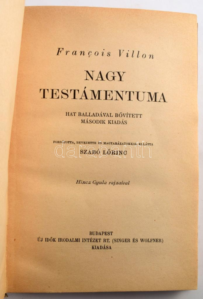 Szabó Lőrinc összes versei. 1922-1943. Bp.,1944, Új Idők, (Singer és Wolfner), 695+1 p. 2. kiadás. Kiadói félvászon-kötés, kopott borítóval, kissé sérült gerinccel. + Francois Villon Nagy testámentuma. Hat balladával bővített második kiadás. Ford., bev. és magyarázatokkal ellátta: Szabó Lőrinc. Hincz Gyula rajzaival. Bp., 1944, Uj Idők, 172 p. Kiadói félvászon-kötés.