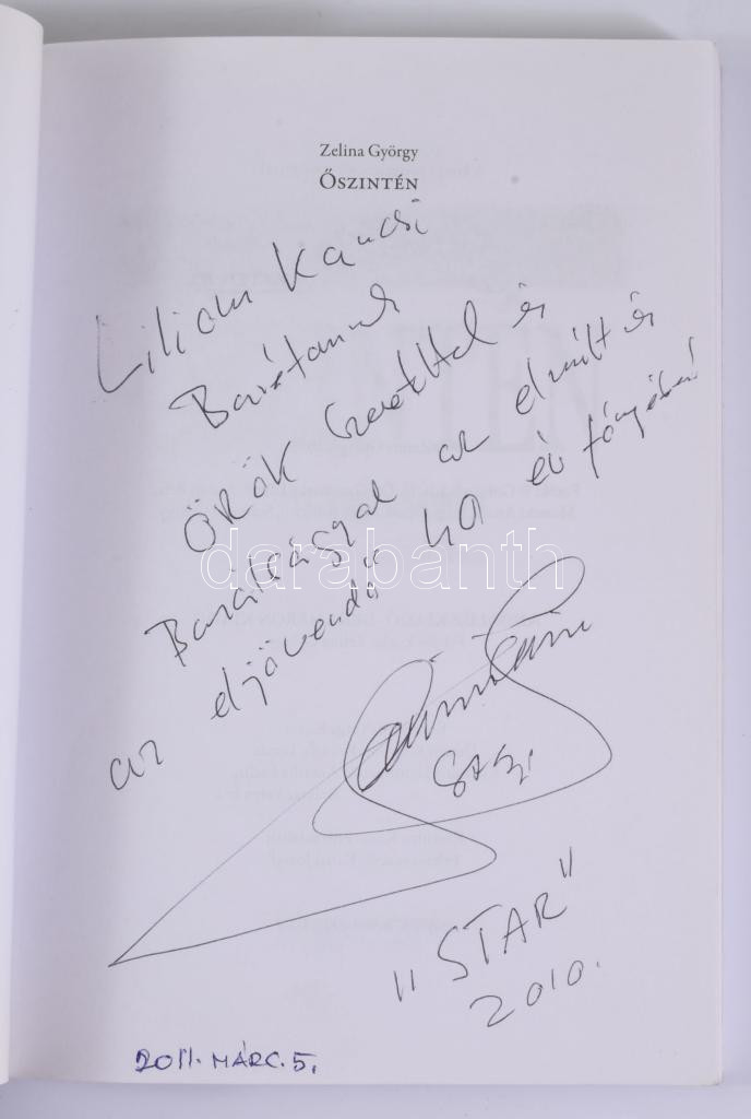 Zelina György: Őszintén. Sasvári Sándor színművész. Ötcsillagos kalandozások. Sasvári Sándor által DEDIKÁLT példány. Bp., 2010, Andalúz - Dekameron. Kiadói papírkötés.