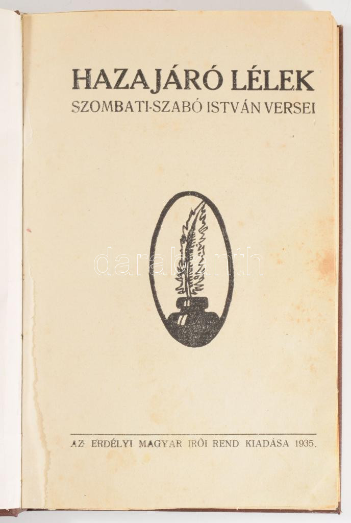 Szombati-Szabó István. Hazajáró lélek. [Oradea-Nagyvárad), 1935., Erdélyi Magyar Írói Rend,(Kálvin-ny.), 1 (a szerző fotója, hártyapapírral elválasztva) t.+ 159 p. Átkötött egészvászon-kötés, kopott borítóval, foltos lapokkal.
