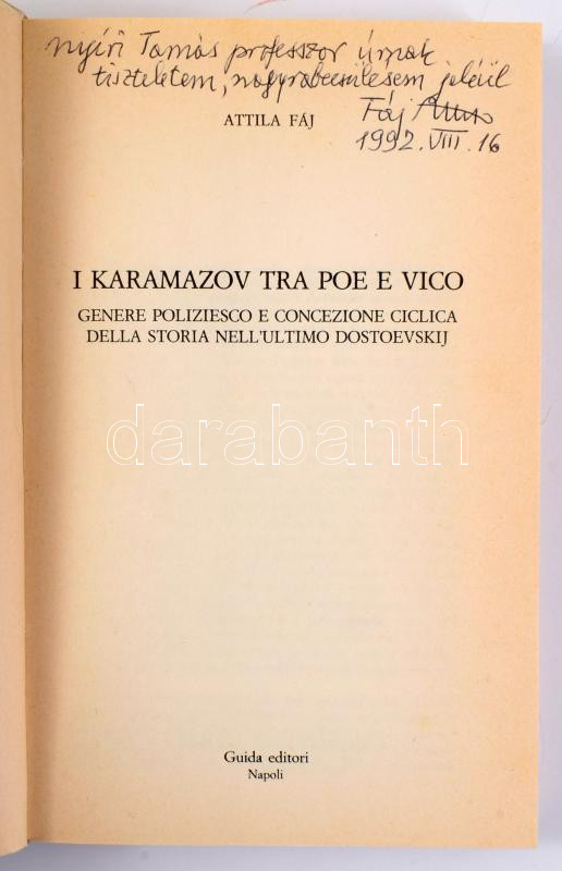 Fáj, Attila: I Karamazov tra Poe e Vico. A szerző, Fáj Attila (1922-2013) irodalomtörténész által Nyíri Tamás (1920-1994) teológus, filozófus részére DEDIKÁLT példány.