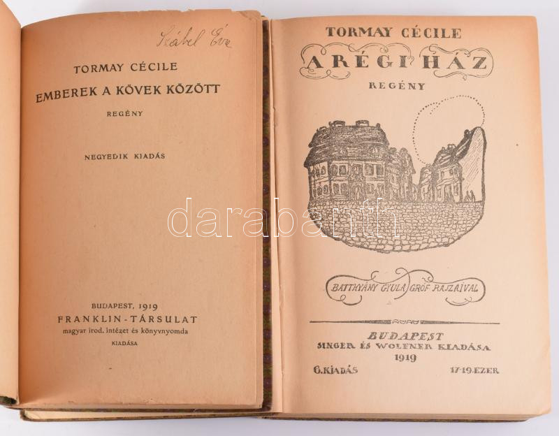 Tormay Cécile 2 regénye: A régi ház. Batthyány Gyula gróf rajzaival. Bp., 1919, Singer és Wolfner, 222+[2] p. Egészvászon-kötésben, tulajdonosi névbejegyzéssel (Hoppe Margit). + Emberek a kövek között. Bp., 1919, Franklin-Társulat, 243 p. Egészvászon-kötésben, néhány kissé sérült lappal, tulajdonosi névbejegyzéssel.