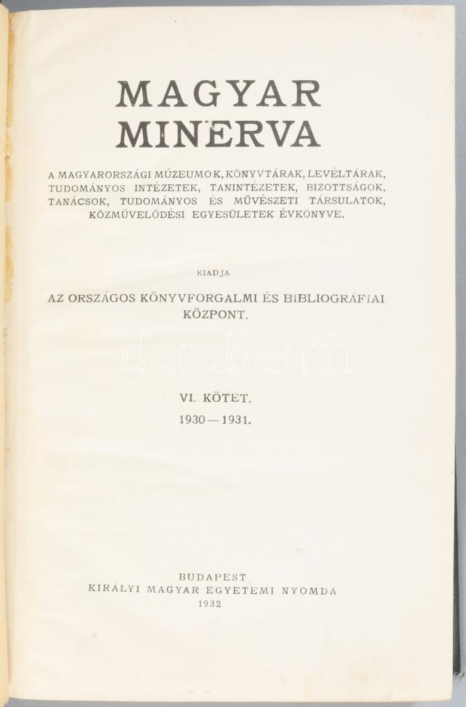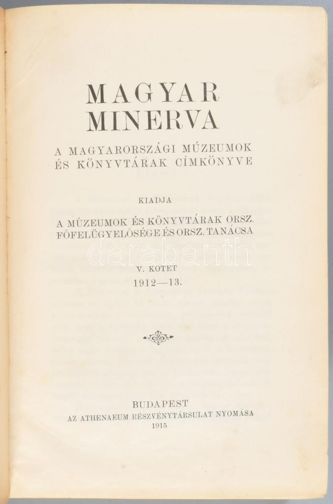 1915-1932 Magyar Minerva. A Magyarországi Múzeumok és Könyvtárak címkönyve. V. kötet: 1912-13. és Magyar Minerva VI. köt.: 1930-1931. A magyarországi múzeumok, könyvtárak, levéltárak, tudományos intézetek, tanintézetek, bizottságok, tanácsok, tudományos és művészeti társulatok közművelődési egyesületek évkönyve. Bp., 1915-1932,Múzeumok és Könyvtárak Orsz. Felügyelősége és Orsz. Tanácsa - Országos Könyvforgalmi és Bibliográfiai Központ,(Athenaeum - Kir. M. Egyetemi Ny.-ny.), VI+1127 p.; IX+976 p. Átkötött egészvászon-kötések.