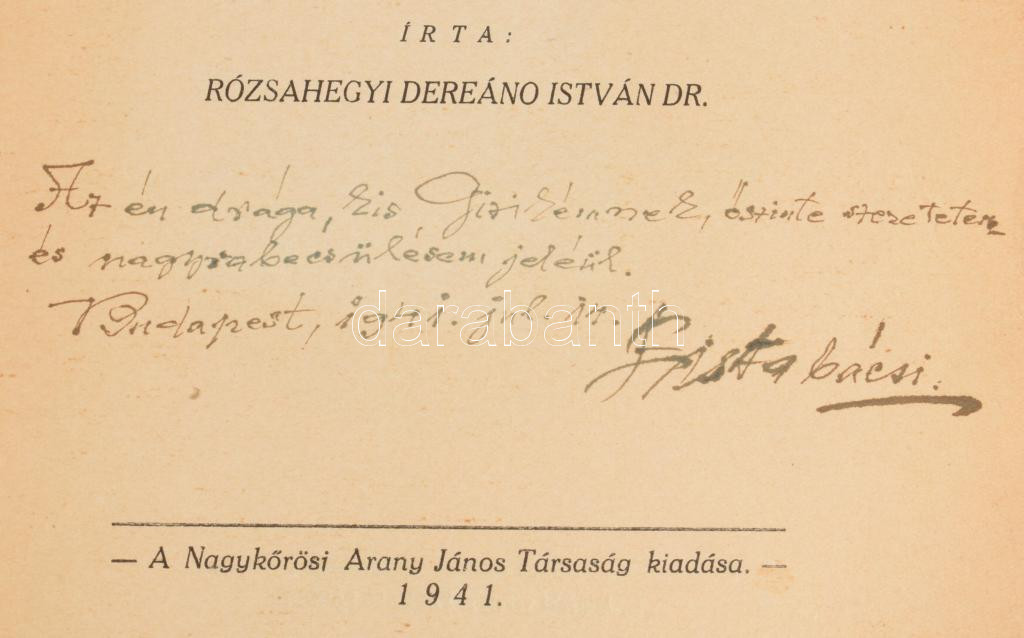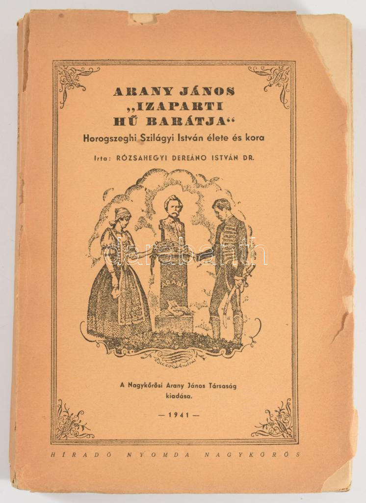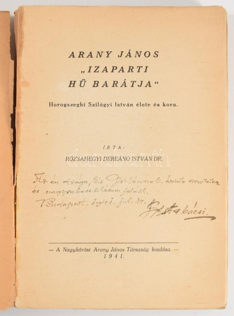 Rózsahegyi Dereáno István: Arany János "izaparti hű barátja." Horogszeghi Szilágyi István élete és kora. DEDIKÁLT! Nagykőrös, 1941, Nagykőrösi Arany János Társaság,(Híradó-ny.), 252 p.+3 t. Kiadói papírkötés, szakadt, sérült borítóval.