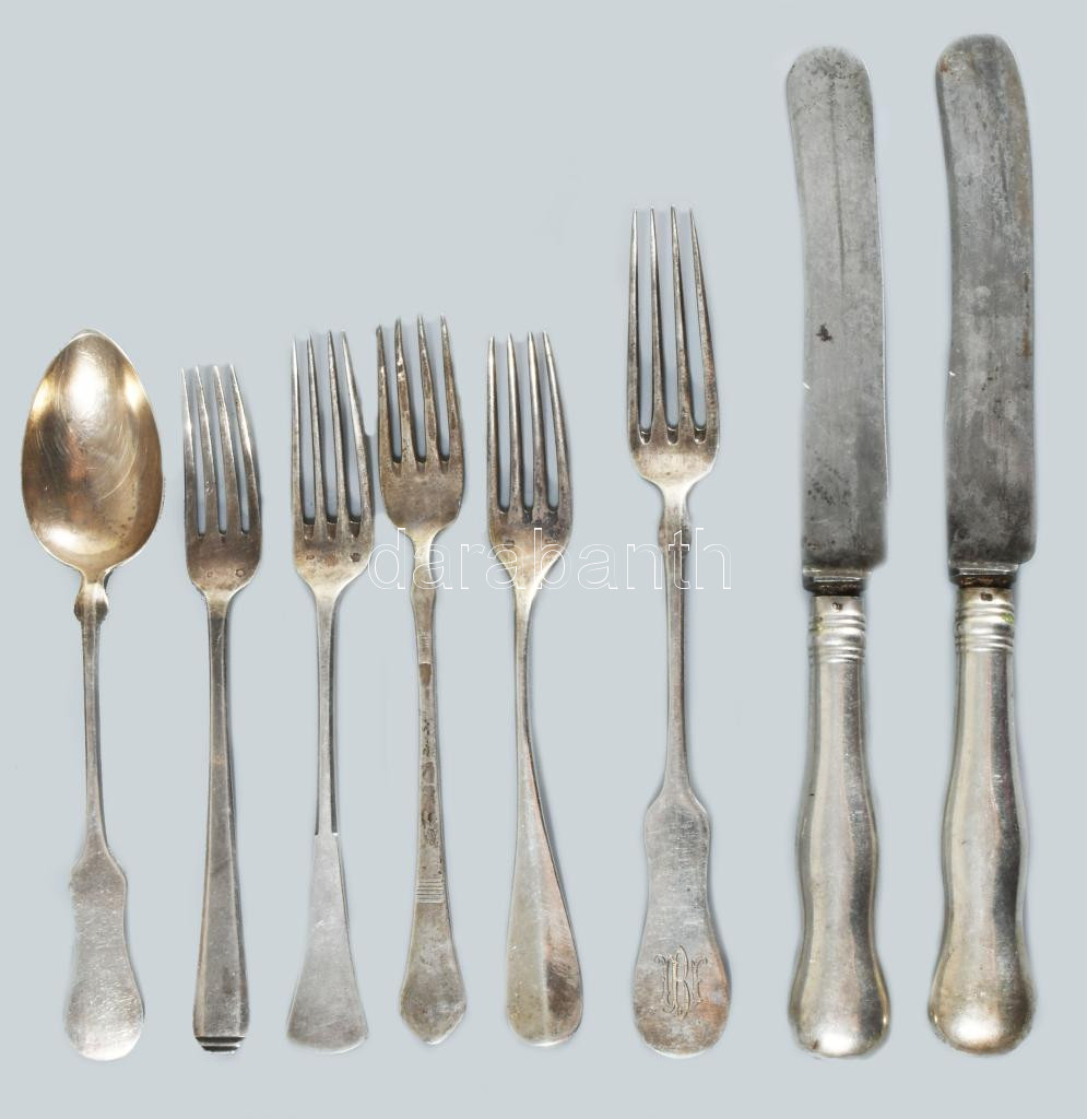 Ezüst (Ag) evőeszközök, nettó 204 g + ezüst nyelű kések. Dianás jelzéssel.