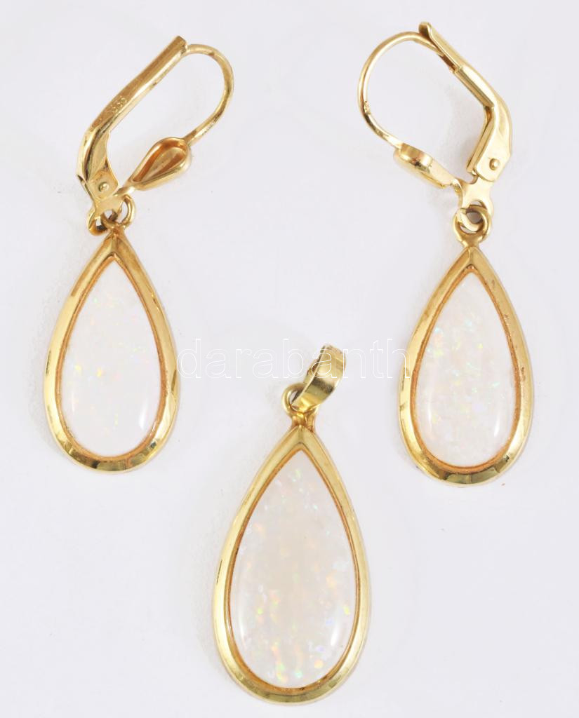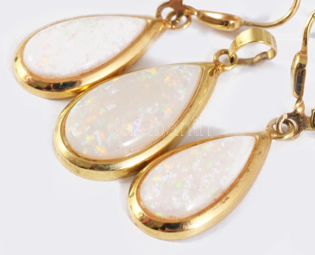 Arany (Au) fülbevaló pár és függő szett csiszolt nemesopál berakásokkal. jelzett, 8k, bruttó 4,1g