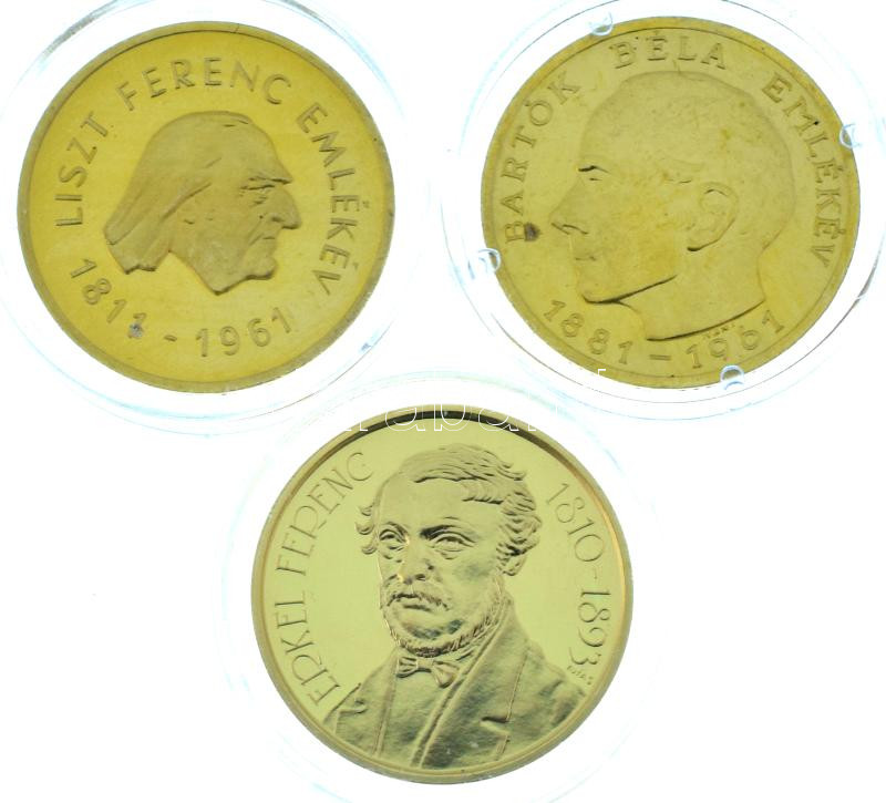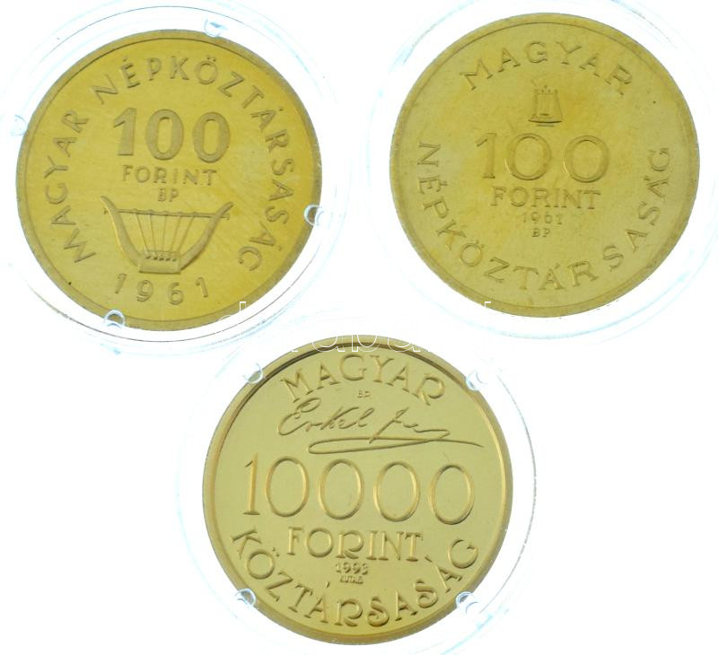 1961. 100Ft Au "Bartók Béla" (7,70g/0.986) + 1961. 100Ft Au "Liszt Ferenc" (7,69g/0.986) + 1993. 10.000Ft Au "Erkel Ferenc" (7,01g/0.986), mindhárom érme kapszulában, dísztokban T:AU,AU,UNC