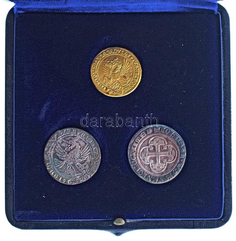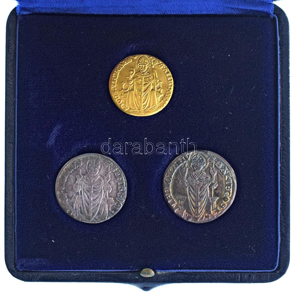 Olaszország / Milánó "Luchino és Giovanni Visconti" utánveret tétel: 1Fl "Szárnyas sárkány / Szent Ambrus" jelzett Au (5,03g/0.999) + 1Gr "Négylevelű liliomos kereszt / Szent Ambrus" jelzett Ag (3,89g/0.999) + 1Gr "Szárnyas sárkány / Szent Ambrus" jelzett Ag (4,24g/0.999) közös dísztokban T:XF patina