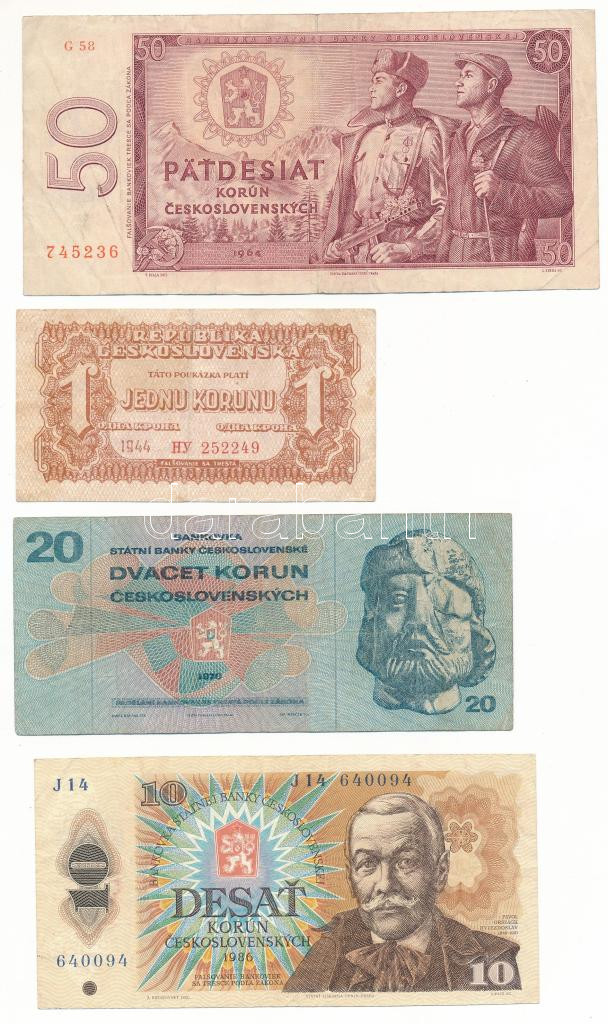 Czechoslovakia 1944. 1 Koruna + 1964. 50 Korun + 1970. 20 Korun + 1986. 10 Korun C:F