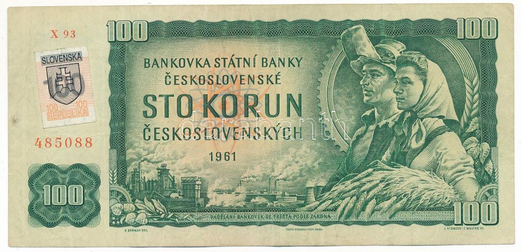 Czechoslovakia 1993. (1961) 100 Korun with Slovak stamp "X93 485088" C:F