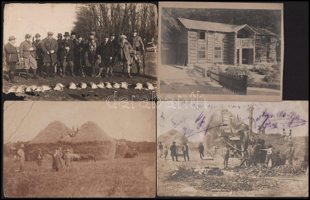 4 db régi fotólap, közte vadászati és mezőgazdasági témájú felvételek, változó állapotban, 9x14 cm és 9x11,5 cm