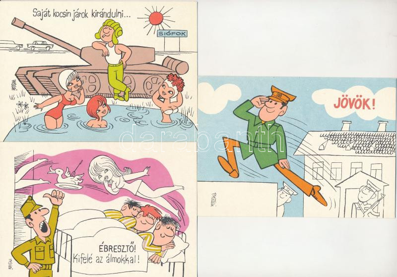 Jelentem kiskatona lettem - 12 db modern katonai humor képeslap sorozat saját tokjában, rajzolta Pusztai Pál / 12 modern Hungarian military humour postcard series in its own case, signed by Pál Pusztai