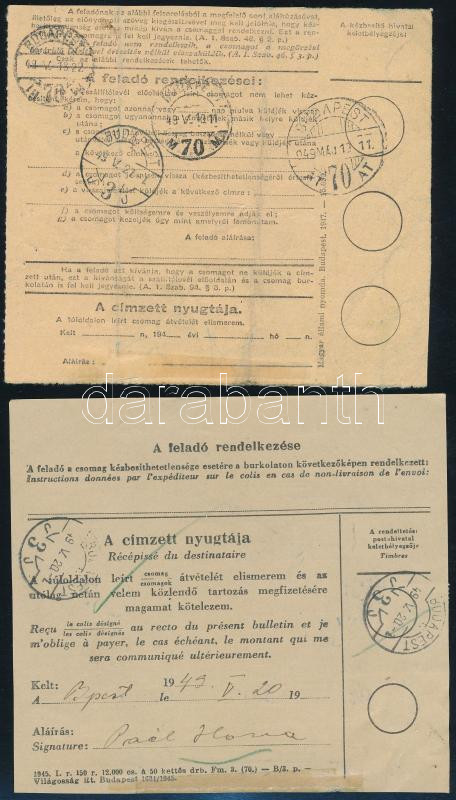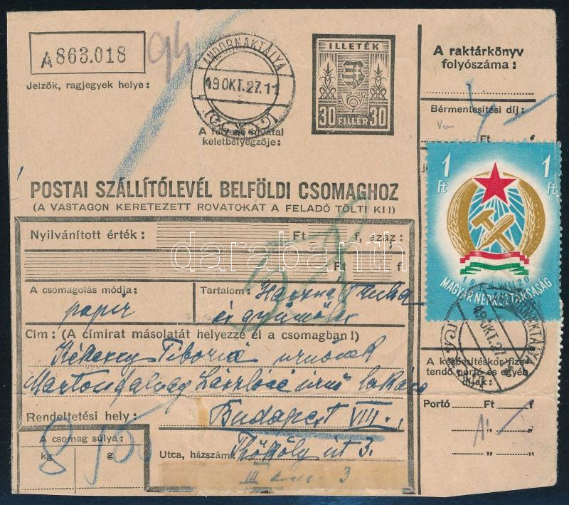 1949 Utánvételes szállítólevél, hozzá pótszállítólevél 70f portóval