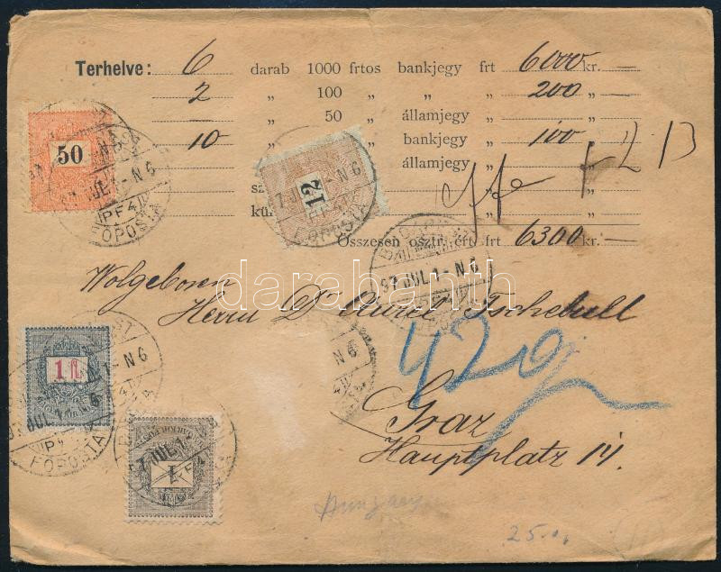 1897 Pénzeslevél 1Ft + kiegészítő bélyegekkel, 1 bélyeg hiányzik "BUDAPEST / FŐPOSTA" - Graz