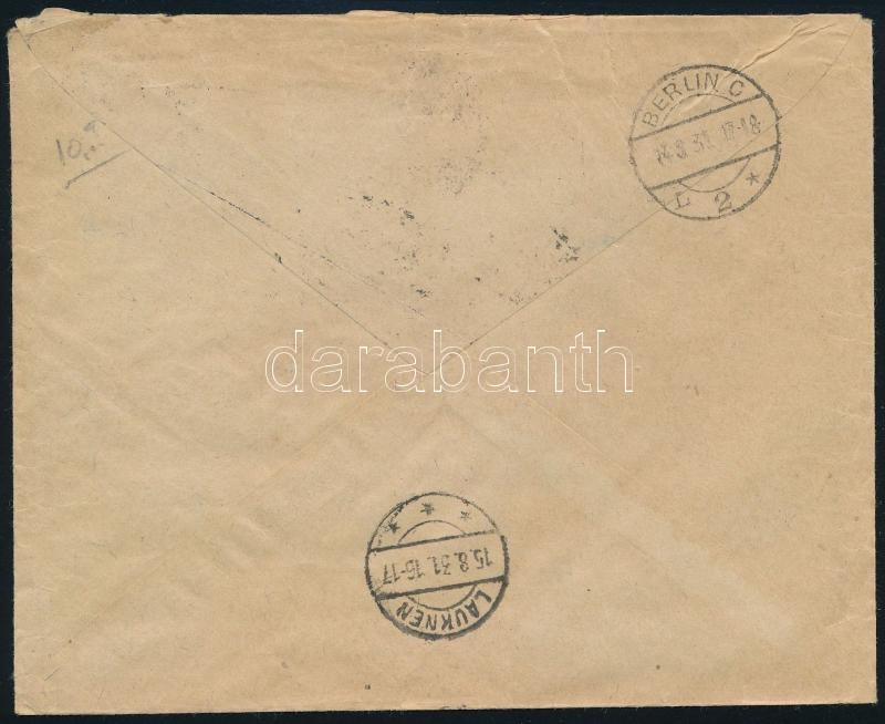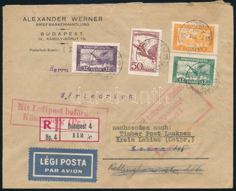 1931 Ajánlott légi céges levél Repülő 4f + 12f + 32f + 50f bérmentesítéssel "BUDAPEST" - "BERLIN" - "LAUKNEN"