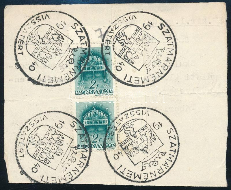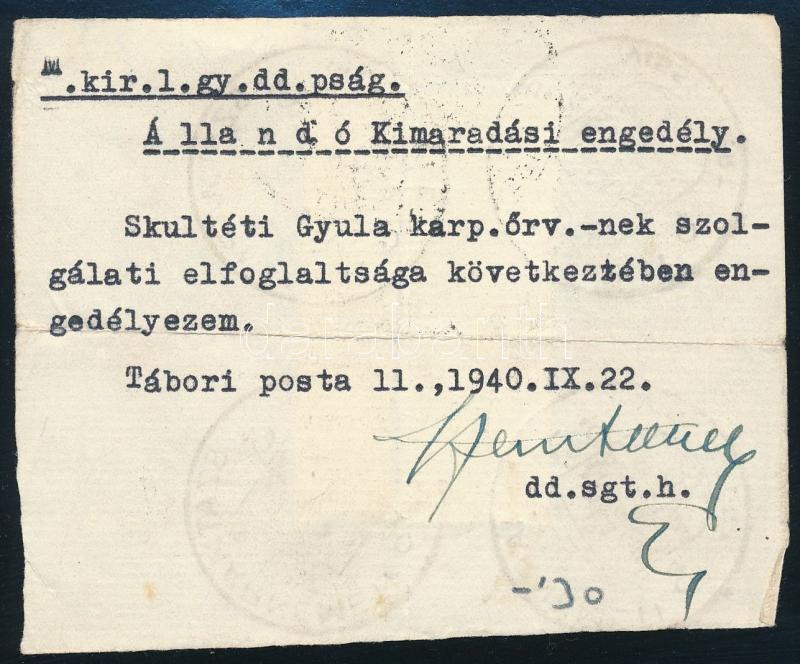 1940 Szatmárnémeti Visszatért alkalmi bélyegzések állandó kimaradási engedély hátoldalán