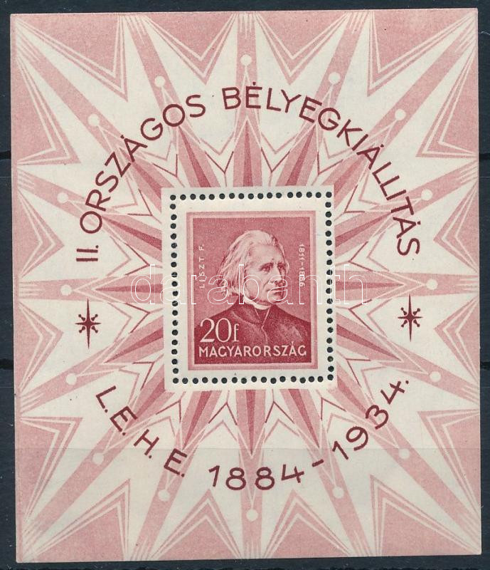 1934 LEHE blokk halvány falcmaradvánnyal; az egyik 8-as szám kissé átüt a papír hátoldalára (25.000)