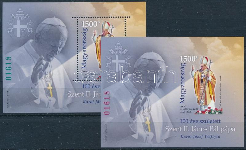 2020 100 éve született Szent II. János Pál pápa túlfogazott + vágott blokk azonos sorszámmal (21.500)