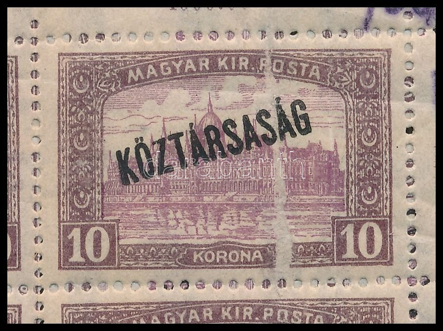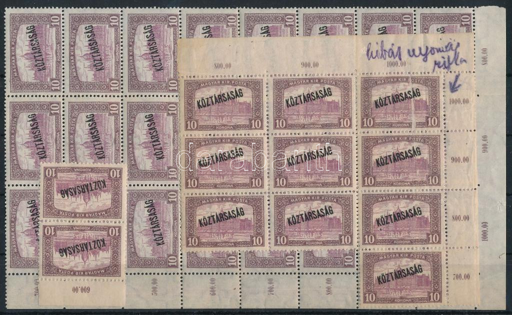 1918 Köztársaság / Parlament 10K 36 db bélyeg ívdarabokban, 1 ívsarki darabon a sérült alapbélyeg került felülnyomásra. Rendkívüli érdekesség!