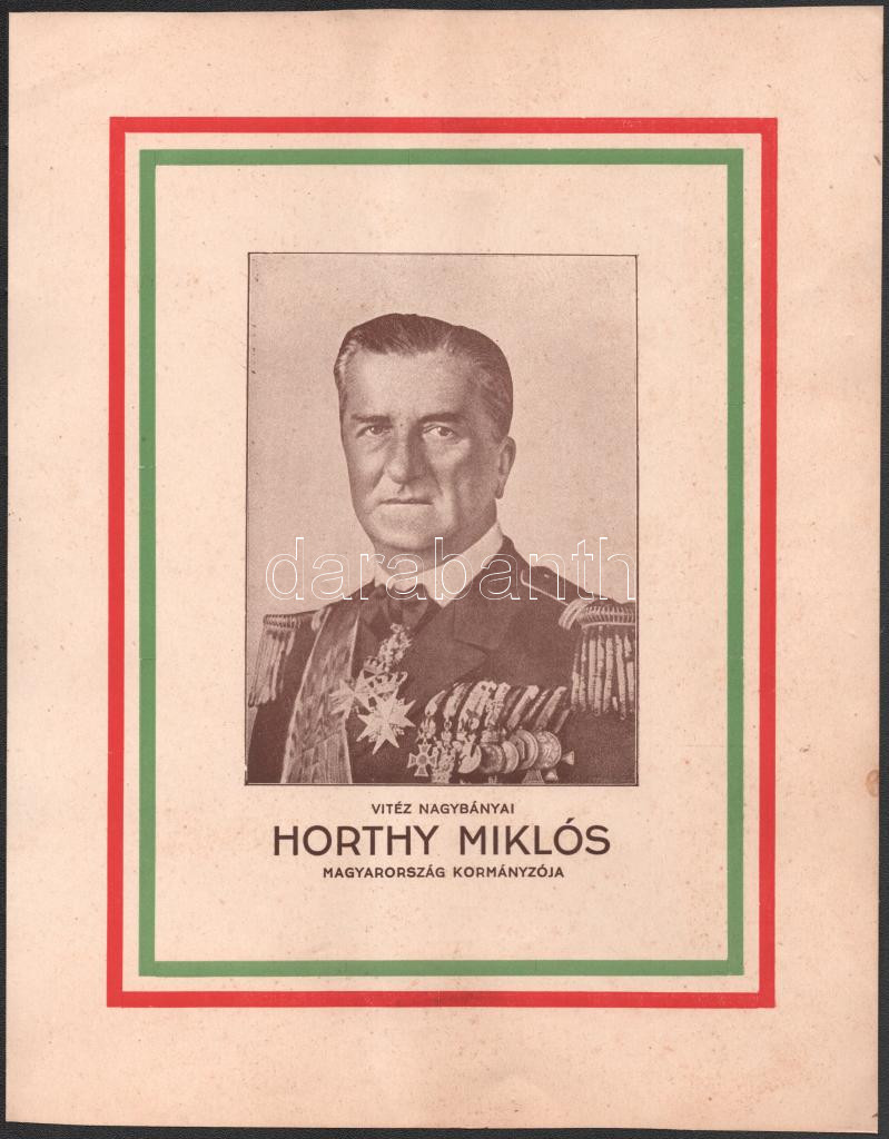 cca 1930 Vitéz nagybányai Horthy Miklós, Magyarország kormányzója, kisméretű plakát-nyomtatvány, Horthy kitüntetésekkel dekorált mellképével, ofszet, papír. 31,5x25 cm