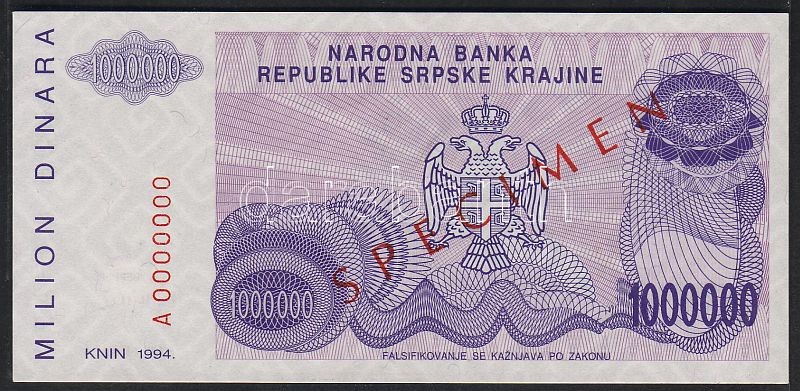 Horvátország/Krajina Szerb Köztársaság 1994. 1000.000D "Specimen 000" ...