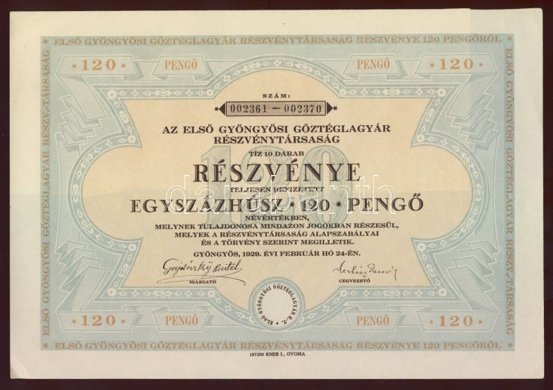 1929 120 P Gyöngyösi Gőztéglagyár Rt. részvény / Share
