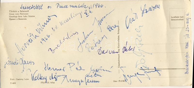 1966 Pinceszínház színészeinek aláírása levelezőlapon