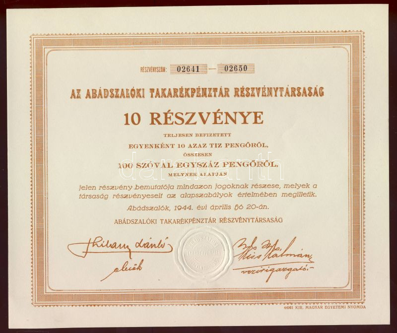 https://www.darabanth.com/en/69-Online-auction/69.0/Numismatics/~262/1913-Nagykaroly-szovetkezeti-uzletreszjegy-50K-plus-1944-Abadszalok-Takarekpenztar-10x10P-ho~II127805