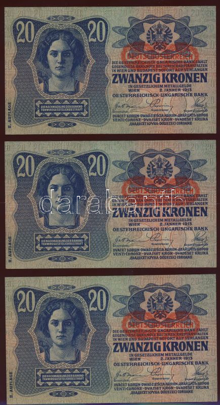 1913. 20K II.kiadás (3x) piros vízszintes, címer alati "Deutschösterreich" fny-sal, egymásutáni sorszámokkal! T:I