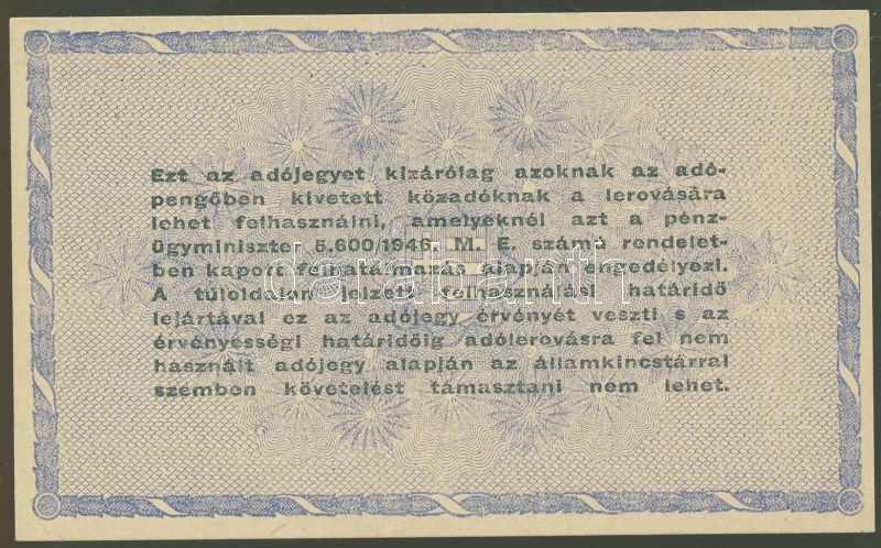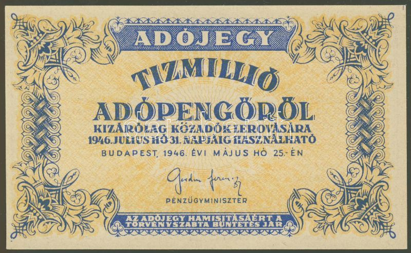 1946. 10.000.000AP barnás-fehér, vízjeles papíron, fordított címerrel ...