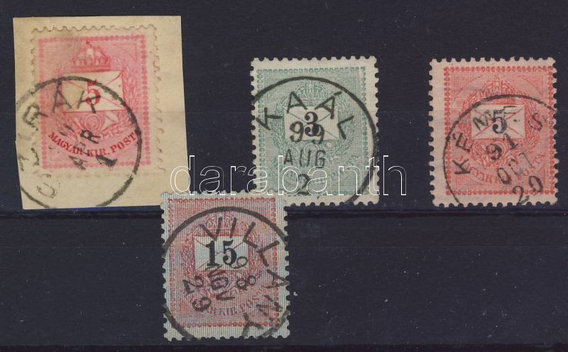 1881-1898. KAÁL, KÉMES, SZIRÁK, VILLÁNY bélyegzések 4db bélyegen (Gudlin 290p)