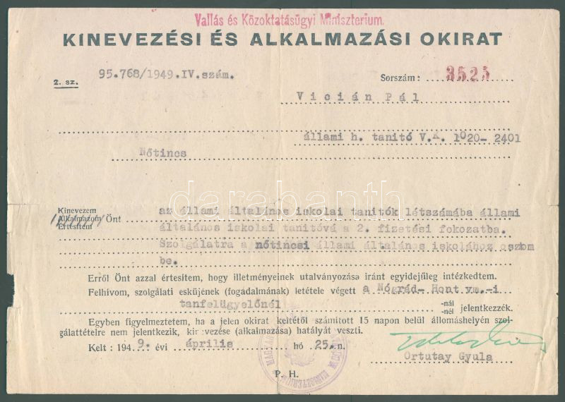 1949 Ortutay Gyula író. oktatási miniszter aláírása kinevezésen