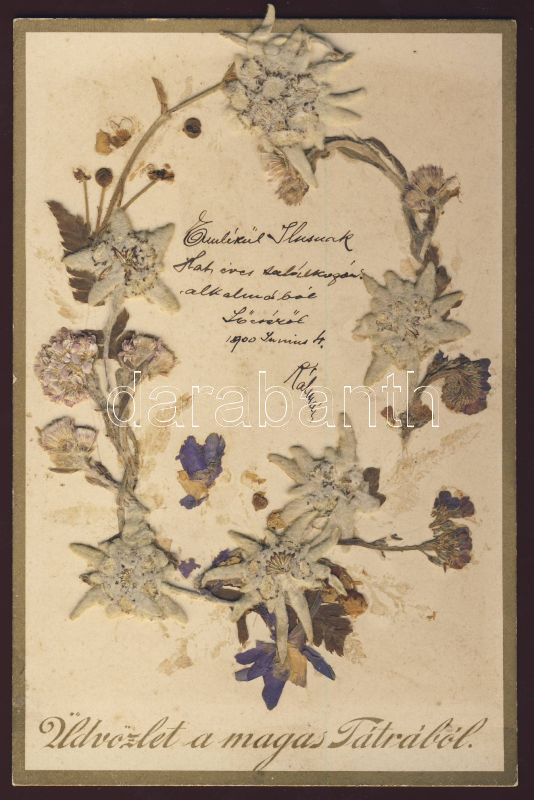 1900 Üdvözlőkártya a Magas Tátrából havasi gyopár és száraz virág dísz...