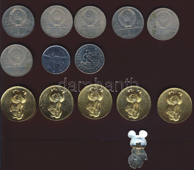 1978-80 Szovjetunió 6klf 1R "Olimpia" + S. Marino 1980. 100L "Olimpia" + Lengyelország 1980. 20Zl "Olimpia" + 5klf szovjet "Olimpia" zseton + jelvény T:1,2