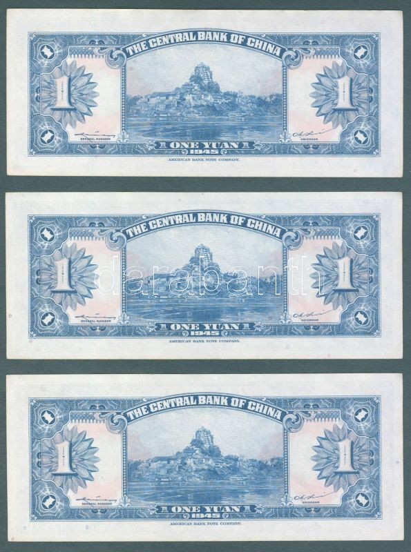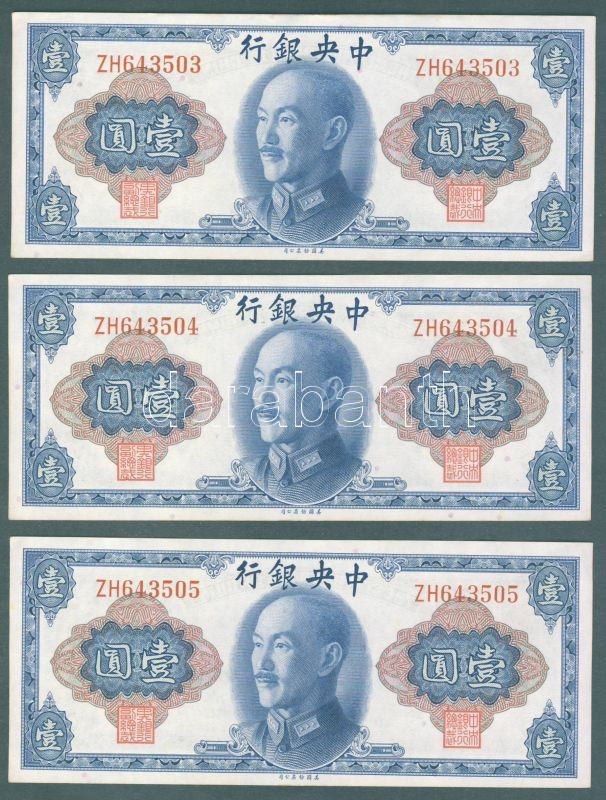 Kína 1945. 1Y (3x) egymásutáni sorszámokkal T:I