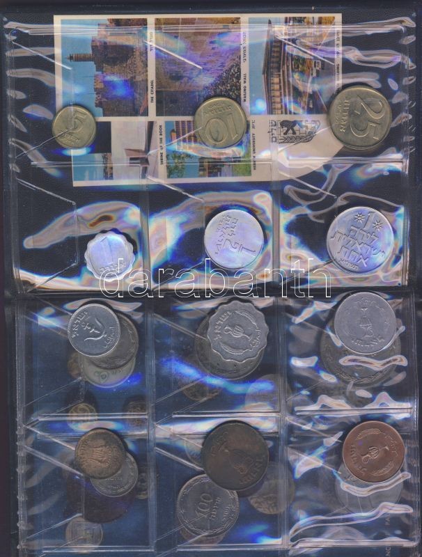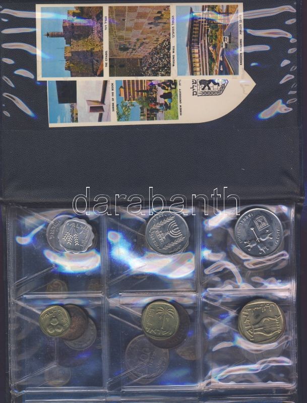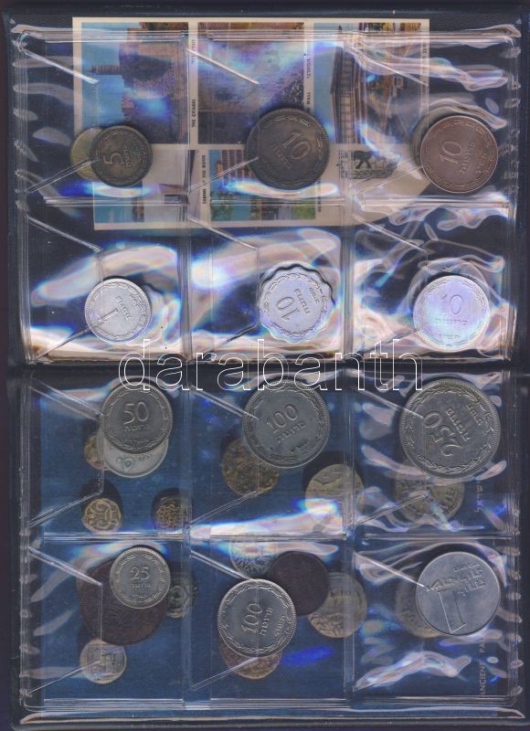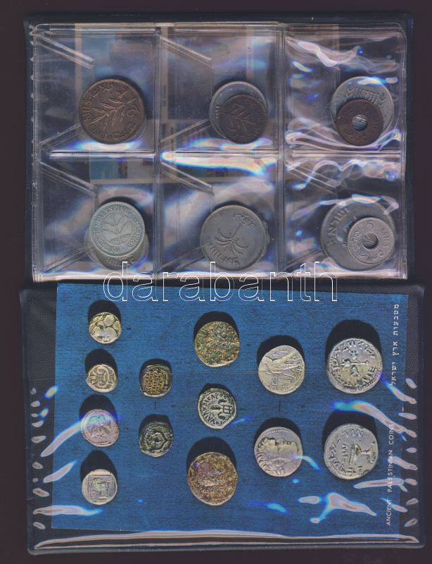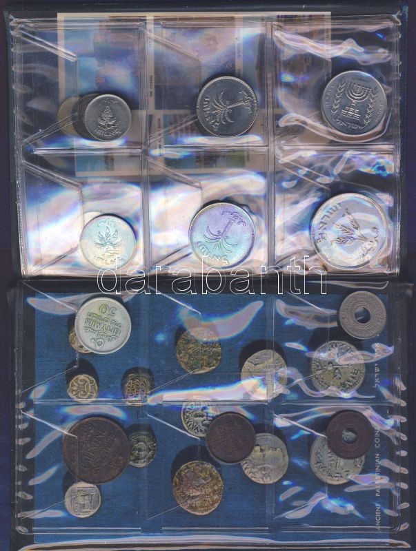 Description: Palesztína 1927-1946. 5klf db közte Ag T:2 + Izrael 1950-es évektől 18klf db T:1,2 (többsége),3 (kevés) kis pénzberakóban, pénzeket ábrázoló képeslappal, jobbakkal