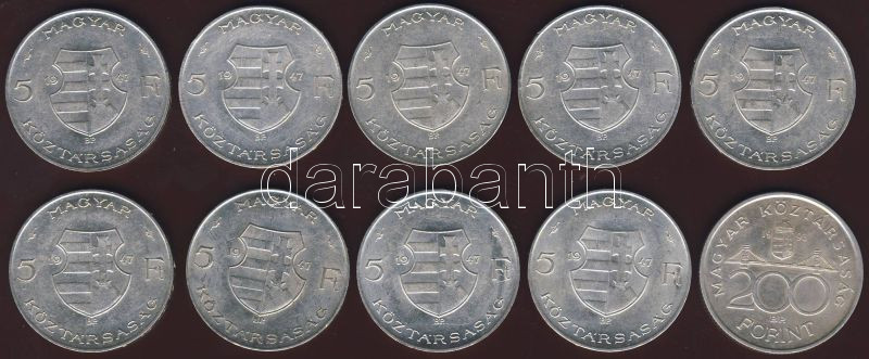 1947. 5Ft Ag "Kossuth" (9x) + 1993. 200Ft Ag "MNB" T:2 (többség),2/3 (...