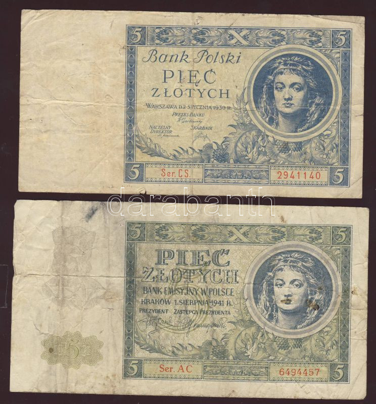 Lengyelország 1930. 5Zl + német megszállás 1941. 5Zl T:III