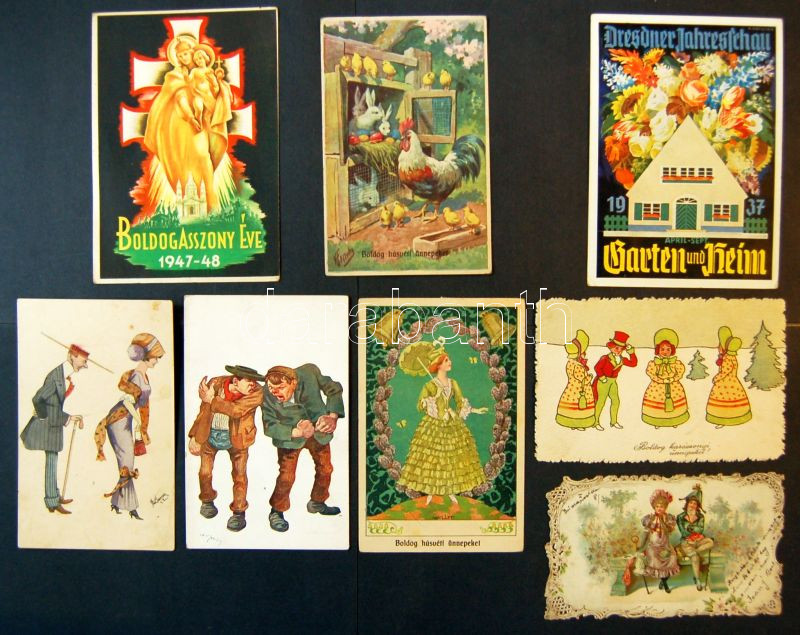 300 db régi vegyes motívumlap közte húsvét, karácsony, újév, sok szignós művészlap, reklám, lóverseny, állatok, utazás, híres személyek / 300 old thematic cards: Easter, Christmas, New Year, artist signed, advertising, animals, horse race, travel, famous people etc.